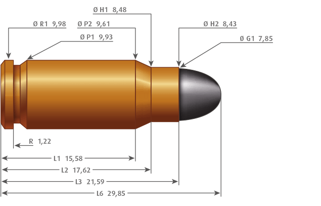 - proiettile di piombo rivestito di rame e ricoperto da uno strato di materiale sintetico